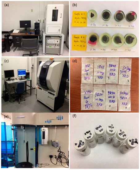 Analysis instruments and samples preparation for the miscellaneous test. (a) Nano-indenter; (b) Sample specimens for the nano-indentation test; (c) X-ray diffraction (XRD); (d) Samples for XRD; (e) Quantachrome Autosorb-IQ; (f) Sample powder for low-temperature N2 adsorption.
