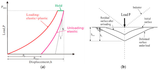 Schematic illustration of the nano-indentation test. (a) Typical indentation load-displacement curve, Reproduced with permission from [20,21], Elsevier, 2019; (b) unloading process, Reproduced with permission from [22], Cambridge University Press, 2019.