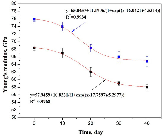 Some researchers obtained the relationship between the Young’s modulus (E) and the adsorption time for the Sc-CO2 injection to the sample with variable lithological character [16,23]. Based on the previous research, we fitted the data for the two samples with a Boltzmann sigmoid relationship between the Young’s modulus (E in GPa) and the Sc-CO2 injection time (t in days) by the curving fitting tool of OriginPro: