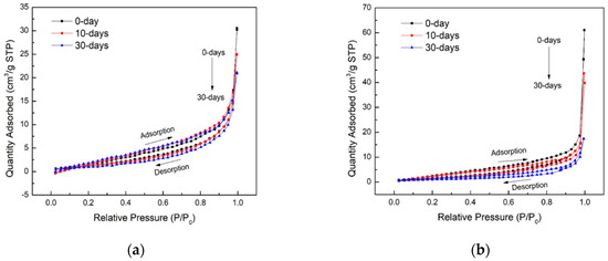 The low-temperature N2 adsorption isotherms of the samples with varied Sc-CO2 injection time (0 day, 10 days, 30 days) are shown in Figure 5. According to the isotherm classification from the International Union of Pure and Applied Chemistry (IUPAC) [24,25], all the curves obtained are following the Type III Adsorption Isotherm curve. At the beginning under the extremely low P/Po applied, the pores of the both samples present micro-pore filling behavior and micro pore volume is related to the adsorption amount. Then, with the relative pressure(P/Po) building up, the isotherm adsorption curve illustrates that the multi-molecular layer adsorption occurred. At higher P/Po, the fluid is at the liquid phase and thus the capillary condensation exists. Comparing the isotherm curves under different Sc-CO2 injection times for the two samples separately, we proposed several interpretations of the effect on the pore structure. Firstly, with the Sc-CO2 flooding time increasing, the adsorption amount trend to increase for the first depth sample while the reverse tendency occurred for the sample at the depth of 9850 ft. Also, the similar isotherm curve for all time slots means that the pore shape did not vary significantly during the CO2 injection, and the slit pore and cylindrical pore dominate the main pore shapes. While the hysteresis loop which illustrated the meso-pore existence, was divided into two scenarios dramatically. For the samples from the depth at 9848 ft (Figure 5a), the width of the hysteresis loop gets wider with the Sc-CO2 injection time extension, which means that after the Sc-CO2 treatment, the presentation of the meso-pore becomes abundant. Meanwhile, the wideness tendency represents that the other pore type shapes intent to the silt pore conversion. For the samples from the depth at 9850 ft (Figure 5b), the hysteresis loop starts to narrow with the Sc-CO2 treatment time increasing, which reservedly indicated that the percentage of the meso-pore tends to reduce. It is also indicated that the pore shape tends to be converted to the plate core from the other types of the pore shape. The plate-shape pores in the Middle Bakken and the slit-shape pores in the Upper and Lower Bakken is advantageous for the flow of the hydrocarbon due to their excellent openness. Both the plate pore and slit pore are advantageous for the hydrocarbon flow in the porous media due to their excellent openness.