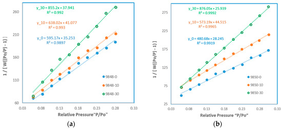 BET plot of 1/[W((P0 / P) − l)] versus P0/P. (a) sample at depth of 9848 ft; (b) sample at depth of 9850 ft.