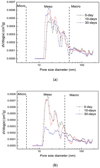 Pore size distribution (PSD) with Sc-CO2 injection time variation. (a) sample at depth of 9848 ft; (b) sample at depth of 9850 ft.