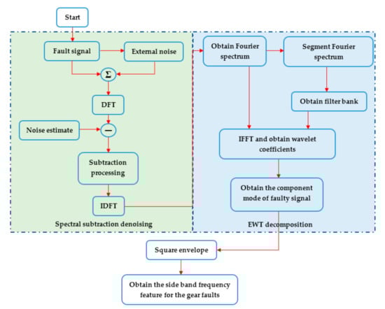A new signal-processing scheme is proposed to detect gearbox faults at constant speed. A flow chart of the fault diagnosis method is shown in Figure 1. To improve the fault information, the spectral subtraction technique is firstly used to remove the partial noise of the signal. The impacted component of the gear fault signal is obtained with the EWT method, and then the side-band frequency of the fault features is obtained with the square envelope spectrum method.