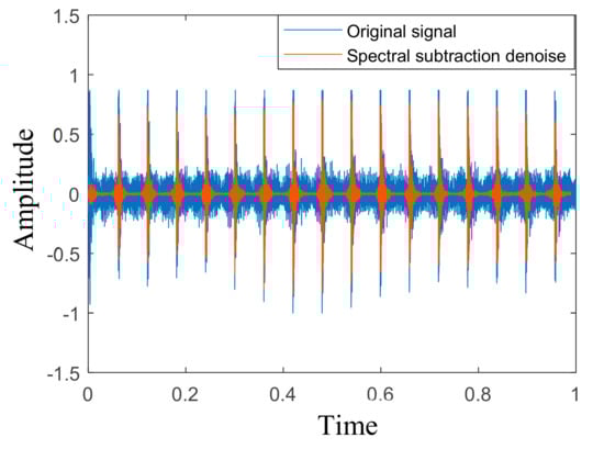 In this subsection, the experimental data of CETIM (Centre des Etudes Techniques des Industries Mécaniques de Senlis) [35] is used to extract the side-band frequency features with the proposed method. The experimental device includes a motor, brake, gearbox, and bearing. The single-stage reducer for the gearbox includes a pinion with 20 teeth and a gear with 21 teeth. The input rotation speed is 1000 rpm, and the sampling frequency is 20 kHz. The spectral subtraction denoising method is applied to obtain the processed signal and compare it to the original signal. Figure 3 shows that the impulse response of the fault information is much clearer.