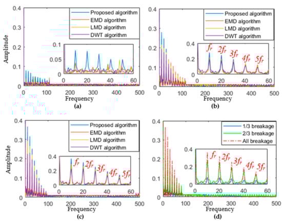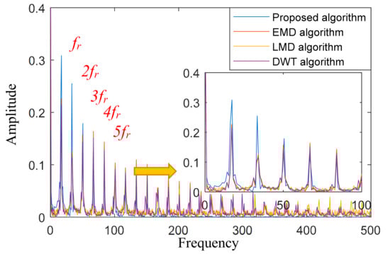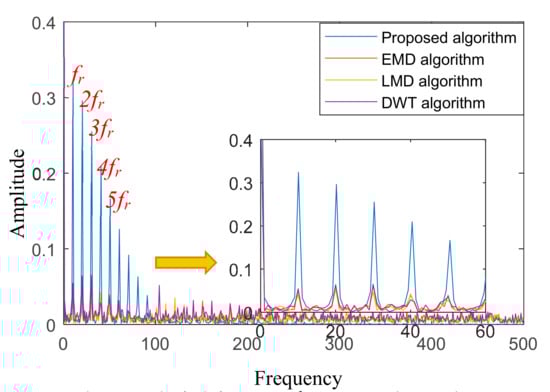 For comparison, the EMD was used to decompose the observed signal into eight IMFs. The added noise signals are complex, so the fault frequency cannot be evaluated directly with the power spectrum. The envelope spectrum of the first IMF contains the primary information of the fault signal. Therefore, the side-band feature frequency can be identified clearly. Then, the LMD is applied to adaptively decompose the added noise signal into several PFs from the high-frequency band to the low one. Several PFs can be obtained with the LMD process. The first PF is selected for further analysis, because it has the biggest correlation coefficient and keeps the most of information from the original signal. Finally, the DWT decomposes the added noise signal to extract the main information of the fault features. The side-band frequency features are extracted from the wavelet correlation of the impulse component with the envelope spectrum. The compared faulty features of the different algorithms are shown in Figure 15.