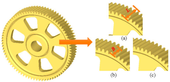 When gears break down, the faulty component often causes an impact, which generates impact energy. Types of gear fault include missing tooth, broken tooth, chipping tip, root crack, and spalling conditions [36,37,38]. However, in the case of a broken tooth, the gearbox needs to change to a new gear. Therefore, in order to investigate the fault features of the helical gear, a different degree fault of breakage gear is implemented in this paper [39]. The tooth width and broken width are defined as L and B, so the degree of breakage is B/L. The breakage size is shown in Figure 6.