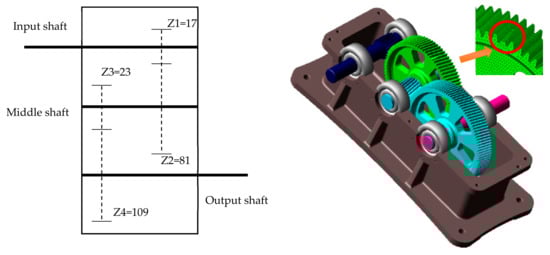Gearboxes are common mechanical equipment that is used to change the rotation speed and transmit power. Since the working conditions of gearboxes are very poor, they are vulnerable to damage and failure. The fault diagnosis of a gearbox is one of the most important issues since people are concerned with maintaining equipment [1]. The vibration signals of a gearbox caused by gear impact, resonation, or mutual interference are very complex in actual working conditions. It is difficult to apply the conventional test and diagnosis methods effectively. The faulty characteristics for the diagnosis of a gearbox is different for different sizes of the cracking tooth, rotation speed, misalignment of gears, and so on [2,3,4]. Many researchers have established dynamical simulation models to analyze gear faults [5]. Brethee et al. [6] established an 18-degree-of-freedom vibration system to study the different degrees of tooth-surface wear. However, their analytical equations are very complex and inconvenient to use.
