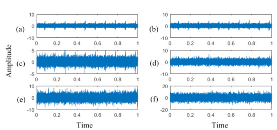 The detection of the side-band frequency was applied to the simulated signal for 2/3 tooth breakage with different levels of noise added. Because there is no external noise, the simulated signal for the faulty gear is very a clear impulse signal, as shown in Figure 9a. However, the vibration signal is weak for an early fault diagnosis of a gearbox and often buried under background noise. Next, the simulated signal with different white noise (10 dB, 5 dB, 0 dB, −5 dB, and −10 dB) was processed by the proposed method. The waveforms are shown in Figure 9b–f in the time domain. The impulse signals become increasingly misty as the SNR decreases, especially with noise under 0 dB.
