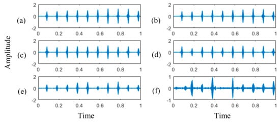 The impulse component with EWT method, (a) no noise, (b) 10 dB, (c) 5 dB, (d) 0 dB, (e) −5 dB, and (f) −10 dB of noise.
