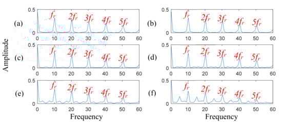 The faulty features with square envelope analysis, (a) no noise, (b) 10 dB, (c) 5 dB, (d) 0 dB, (e) −5 dB, and (f) −10 dB of noise.