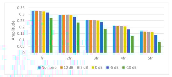 In Figure 12, the proposed signal processing can effectively extract the side-band frequency component, and stably obtain the fixed amplitude value where the SNR level is low. As a result, the proposed method indicates that it can largely enhance the representation of the faulty gear component and make the amplitude of the side-band frequency more stable under the strong noise.
