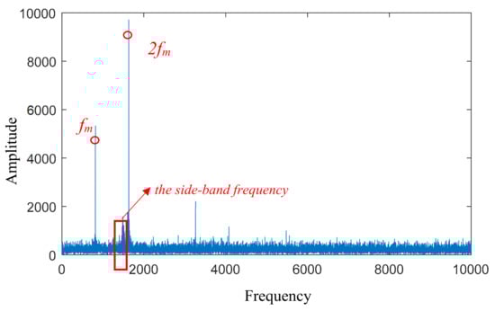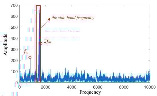 To verify the effectiveness of the proposed method, the simulated signal with 5 dB of noise was considered on the 2/3 tooth breakage situation. The frequency spectrum is obtained with the spectral subtraction method. Figure 13 shows that the side-band frequency under the strong noise is hardly extracted from the frequency spectrum. However, the spectral subtraction method can enhance the amplitude value of the side-band frequency region more than the gear meshing frequency region. The results are shown in Figure 14. The side-band frequency features are extracted by the EWT method.