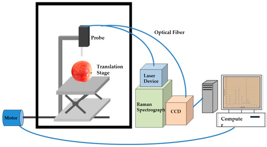 Pesticide residue detection system developed by the lab was used to collect Raman spectral information in the study. The pesticide residue detection system included a laser device, Raman spectrometer, photoelectric charge coupled device, camera, optical fiber, probe, computer and other hardware. The effective detection range of the system was −186.45~2325.72 cm−1. During the study, the excitation light power of the system was 500 mW with a wave length of 785 nm. The pesticide residue detection system was shown in Figure 1.