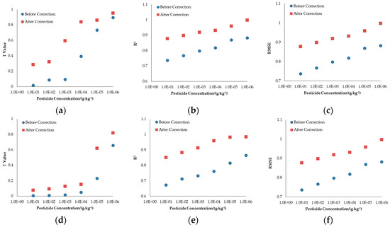 Results of regression model between pesticide concentration and T value, R2 and Root Mean Square Error (RMSE). (a): T value of acetamiprid; (b): R2 of acetamiprid; (c): RMSE of acetamiprid; (d): T value of deltamethrin; (e): R2 of deltamethrin; (f): RMSE of deltamethrin.