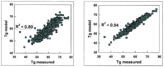 Neural network based methods for the glass transition temperature Tg for a series of polymers. Different models were built leading to different quality with R2 ranging from 0.80 to 0.99. It can be seen clearly that for R2 < 0.99 the model does not describe all Tg values within a few degrees.