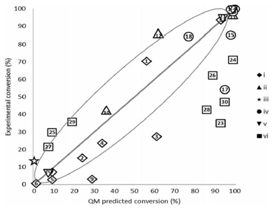 with the final amine as given target molecule, the initial ketone is known and the question is what is the right choice for the initial amine to have a successful transformation (equilibrium largely on the right-hand-side). Relatively simple quantum mechanical calculations have been shown to be a successful toll to predict whether the reaction is thermodynamically favourable [34]. The oval in Figure 3 shows the effect of a 4 kJ/mole difference on the conversion and the data displayed reveal a good correlation between experimental data and model to allow for adequate predictions in an industrial context. The data that are really outside the oval on the right-hand side are those for which from experiments it is known that enzyme inhibition is known likely to occur.