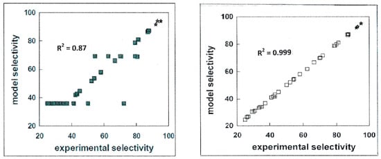 For a catalyst, it can be important to know whether its selectivity is high, preferably close to 100%. This if different from, for example, the Tg case in the previous section, as now it only matters if a predicted high selectivity is indeed high in experiment. Whether low selectivity is predicted well or not is of no practical relevance. We illustrate this in the graphs in Figure 4. Although the model with R2 = 0.999 shows an almost perfect correlation and the one with R2 = 0.87 not, for the purpose of predicting high selectivities they do equally well—both predict the same 3 data points at the right-hand top of the graph as being good catalysts with high selectivity (both prediction and experiment show high selectivity).