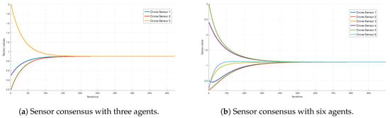 if and only if the sensor network is connected and where correspond to the maximum eigenvalue of the graph in absolute values, then the agents on the network will converge to the average of its initial conditions as shown below in Figure 4.