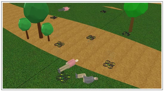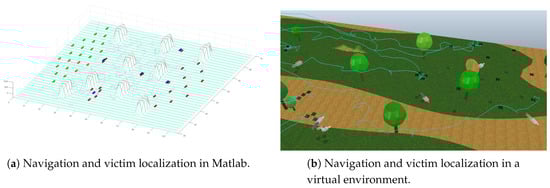 In order to perform experiments for swarm navigation, sub-swarm generation, and victim detection, the multi-agent model previously explained was implemented using Matlab and VRep. The Matlab implementation was performed with the aim to evaluate the proposed mathematical model in different scenarios and behavioral cases as previously named. VRep was used to perform simulations of the proposed swarm behavior model over 3D environments with a virtual model of real robots as Drones. The principal objective of the VRep simulations is to validate the proposed system using a more realistic environment as shown in Figure 5.