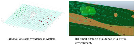 The first version of this experiment is performed using 23 agents and two cases of a single obstacle avoidance are performed. The first case is a small obstacle as shown in Figure 6. This part of the experiment depicts how the swarm goes around the obstacle in order to avoid it. In VRep simulation, the small obstacle is represented by a bunch of trees. This simulation shows how the obstacle is avoided by the swarm’s drones flying around the trees. This is possible because the obstacle is relatively small and the agents are able to tolerate the obstacle between the attraction forces. The second version uses a big obstacle as depicted in Figure 7. In the second case, the agents avoid the obstacle by taking a side path. The big obstacle is represented by a building in VRep-simulation, where the swarm of drones navigates describing a side path to the building. This avoiding obstacle strategy occurs because there is not enough space between the attraction forces to allow broad obstacles to stay in between the agents.