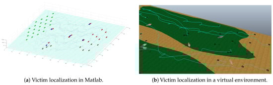 This is a complete case where the swarm navigates through the area full of obstacles and some places with potential victims. The experiment uses 23 agents and 6 victims distributed in 5 victim places, given there are 2 victims in the same place as shown by Figure 10 this case depict how the swarm covered the area navigating through obstacles and localizing potential victims at the same time. The simulation shows how the proposed model generates sub-swarms with more drones in places where there are more victims or where the probability of finding victims is greater. This case is represented in the virtual environment simulation, where there is a place with two victims and the model assigns a sub-swarm with 6 drones. This victims place has more assigned drones that the other places. VRep Video simulation of Navigation and Victim Localization in Ref. [42].