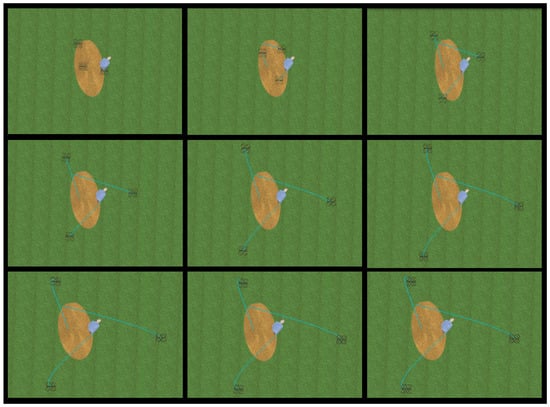 This experiment shows two cases of possible victims with different detection probability. The first case presents two victims in an open field with a high probability to be detected by the drone sensors as shown in Figure 11. Given the victim detection is easy for this case, the swarm is made up of 6 agents located in the vicinity of the victims. After sub-swarm creation, the consensus and control formation algorithm is performed as shown in Figure 11 as explained previously in this paper the consensus looks for to approach every drone to the victim, reducing the uncertainty of sensing factor over the possible victim. Additionally, the formation control redistributes the drones in a circle around the victim with the aim to provide better assistance to the victims and balance the sensor measurements. The second case presents a victim with the body partially covered and a sub-swarm of three agents. The number of agents for this case is lower than the first case given the difficulty of the victim detection. Once the victim is detected, the sub-swarm executes the processes of consensus and control formation as shown by Figure 12.