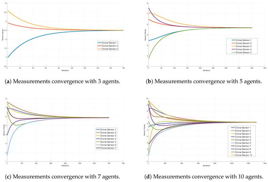 In order to perform a convergence analysis, it is worth mentioning that the estimation algorithm was carried out in a computer with the following specs: 7-th generation core-i7 microprocessor, 32 GB installed memory (RAM) and NVIDIA GEFORCE . Several simulations were performed with the aim to know the algorithm performance under different parameter values. The principal parameter taken into account is the number of agents able to take a measurement, which in this case vary from 3 to 10. Additionally, in the interest to prove the robustness of the estimation algorithm, the measurement values are settled in a random way. In this way, the convergence of the algorithm depending on the number of agents is shown in Figure 13. Where it is appreciable how the convergence is affected by the number of agents. The greater number of agents giving measurements the more time it takes the algorithm to converge.