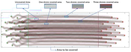 The experiment aim is the percentage calculation of the unexplored and explored area by at least one, two, three, or more drones. Figure 14 shows the simulation of the experiment and the representation of different degrees of exploration for the areas covered by the drone in its trajectory towards the endpoint.