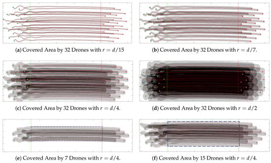 The Figure 15 shows different experimental cases where the covered area by the swarm is depicted by several gray color levels through the path to the endpoint. Figure 15 shows how explored area changes according to the relationship between r and d. In Figure 15 from (a) to (d) is showed the covered area using a swarm of 23 agents. The covered area increases according to r value approaches to d. Figure 15e,f shows how the explored area is affected by the swarm agent number. The covered area percentage in relation to the values of r and d is depicted by Table 2, which describes seven experiments where the rate between r and d is studied from to . From Table 2 it is concluded that explored area increase significantly through the increase of the r factor. The equilibrium point is reached when because is in this point, where 100% and 80% of the entire area is explored by at least two drones.