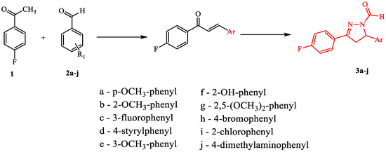 The second step included synthesis of desired compounds from synthesized chalcone, hydrazine hydrate and formic acid under reflux for 10 h. The mixture was cooled, the obtained precipitate filtered and dried.