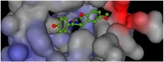 Potential surface representation catalytic domain of PDE5 with docked compound 3g. (Range of potential: from min. 1.77 mV (blue) to max. 0.541 mV (red)).