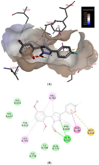 The binding site of PDE5 was defined according to the inhibitor—halogen derivate of monocyclic pyrimidinones (PDB ID: 5IO). Molecular docking confirmed the previous findings of characteristic binding interactions of inhibitors with the PDE5 catalytic domain [29]. Key interactions of compound 3g are bidentate hydrogen bond (H-bond) with the side-chain of Gln817. One H-bond is formed with an oxygen atom of the carbaldehyde, and the second one with the nitrogen atom of pyrazole ring (Figure 4). Based on van der Waals interactions, pyrazole ring interacts with the side chain of Phe820. Side chain of Val782 forms π-π interactions with pyrazole ring and dimethoxyphenyl ring. The same ring is bonded to the Tyr612 by the π-donor hydrogen bond. Interactions of fluorophenyl ring are mediated through the π-σ interactions with Phe786 and π- sulfur interactions with Met816.