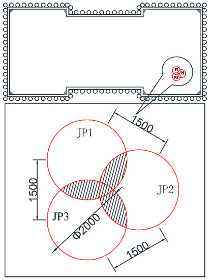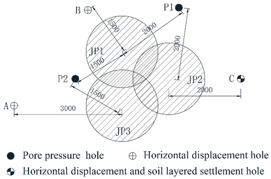 - There were three monitoring holes for the horizontal displacement of the deep soil. Since the depth of the jet grouting pile ranged from 8 to 40 m below the ground, considering the difficulty of forming the hole and the unconstructed jet grouting pile from 0 to 8 m below the ground, the monitoring hole was designed to be fixed at the upper end and free at the lower end, and the depth of the embedded body was 8 m. Each measuring hole had a depth of 18 m, and the order was A, B and C. Measuring hole A was 3 m from the center of JP3, measuring hole B was 1.5 m from the center of JP1, and measuring hole C was 2 m from the center of JP2. The plane layout is shown in Figure 4.