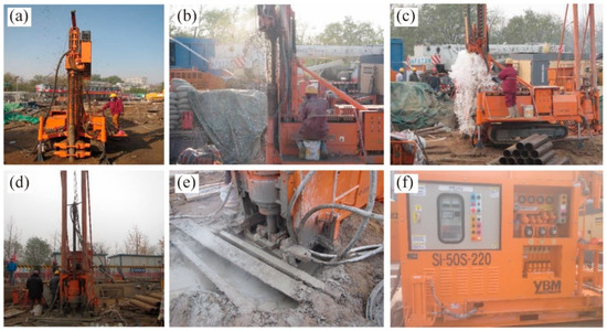 - The test pile construction sequence was JP1, JP2 and JP3. The construction of JP1 began on November 27, 2015 and was completed on 30 November 2015. JP2 and JP3 were constructed similarly. The construction of JP2 and JP3 began on 1 December 2015 and was completed on 7 December 2015 (construction process photos are shown in Figure 6).