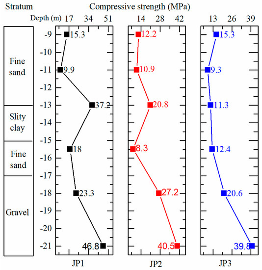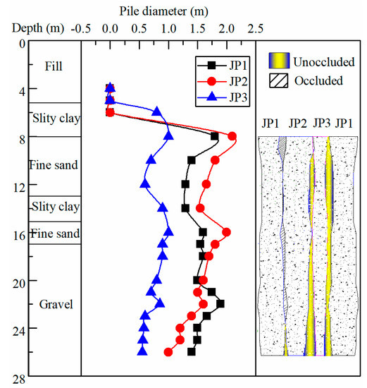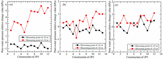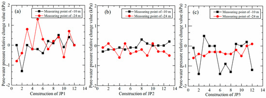 - In the construction process of JP1, JP2 and JP3, the relative pore pressure at positions of –10 m and –24 m in the measuring hole P1 was within 1 kPa, and the variation was very small (see Figure 11). It showed that the ultra-high-pressure jet grouting did not form excess pore pressure, and the stratum outside the designed pile diameter range was nearly undisturbed during ultra-high-pressure grouting.