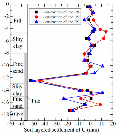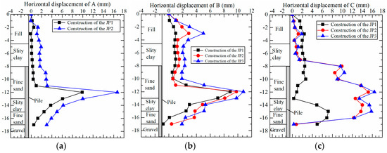 - Measurement point A could not be monitored due to the equipment occupancy during construction of JP2. From the monitoring curve analysis of measurement points B and C, the cumulative change trend of each measurement point under the construction of JP1, JP2 and JP3 was consistent, but the cumulative growth change value was very small. For example, the horizontal displacement of measurement point B reached 8.9 mm at a position of –13 m during construction of JP1, but the cumulative change values were 9.8 mm and 10.8 mm during the construction of JP2 and JP3, respectively, and the variation was very small (see Figure 9b); the behavior at measurement point C was similar (see Figure 9c). The reason was that JP1 was located between measurement point B and JP2 and JP3. After solidification of JP1, measurement point B was isolated. Therefore, the construction of JP2 and JP3 had little effect on the horizontal displacement of measurement point B. During the construction of JP2, the cumulative value of the horizontal displacement of measurement point C increased greatly, but during the construction of JP3, the cumulative increase in the horizontal displacement was very small. The reason was that JP2 was closest to measurement point C and was located between measurement point C and JP3. Therefore, the construction process of JP2 would have the largest influence on the horizontal displacement of measurement point C, and the solidification of JP2 occurred; measurement point C was isolated. The construction of JP3 had little effect on the horizontal displacement of measurement point C.