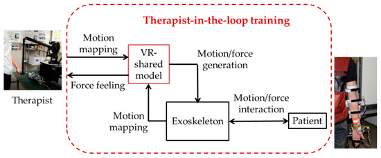 This paper is organized as follows. The background and related research are introduced in Section 1. In Section 2, the schematic of the implemented training platform and the visually shared model are introduced. In particular, the 2-port network model is introduced for transparency between the master and slave sides of the proposed platform. In Section 3, the models for patient-exoskeleton interaction and therapist-haptic device interaction are given. The experiments and results are given in Section 4 including patient-exoskeleton, therapist-haptic device interaction, and a therapist-in-the-loop test. Lastly, the conclusion and future works are discussed.