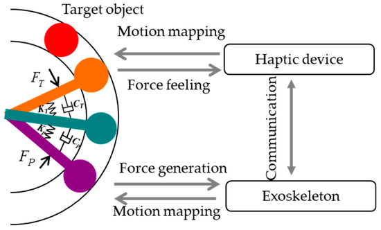 where kT and kP represent the coefficient of elasticity on therapist and patient sides, respectively, and represent the viscosity coefficient on each side, θT and θp represent the change in the spring’s length, which is in accordance with the forearm flexion/extension angle of therapists and patients, and and represent the velocity of the spring’s deflection. The θT is calculated from the relative kinematics with the haptic device, and the θp is measured with an inertia sensor (MTx sensor, Xsens, Enschede, the Netherlands) mounted on the forearm [28]. Moreover, the additional merits of the proposed visually shared model for realizing and appropriately adjusting of training strategies and the amount of kinesthetic guidance provided over the session are summarized as follows: (1) when the patient needs assistance, the therapist can provide assisting force through the training model and the force can be generated by exoskeletons. It is also an assist-as-needed strategy, which was proven to be more effective. During the assistive training, the robot guides patients while assisting them towards the correct path; (2) during the supervision of the therapist, the therapist can also provide extra resistive force which is generated by exoskeletons with an impedance controller. In this case, the exoskeleton may dissipate parts of the energy generated by the patient to make the task more challenging; (3) the platform provides a high transparency with the model. Here, the master (patient) and slave (therapist) sides of the proposed platform can be represented by a 2-port network model which is distributed at both ends, and it is important to keep the transparency.