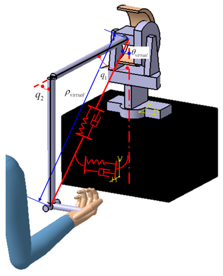 The visually shared training model shown in Figure 2 was proposed for elbow joint rehabilitation based on the neuro-rehabilitation theory that states that the brain has the ability to reorganize through sensory input, experience and learning [29]. The visually shared environment provides patients with goal-oriented tasks that enable them to use their decision-making abilities. The coefficients of springs ( and ) and dampers () shown in Figure 2 can be selected according to the predetermined muscle strength assessment system [27]. In particular, increasing the stiffness and viscosity in the model can relatively reduce the position-dependent and velocity-dependent error between the motion of the therapist and the one allowed for the patient [16]. Also, the patient is allowed to make errors in tracking the target object while performing motor tasks, which has been proved to be an essential factor for motor learning [30].