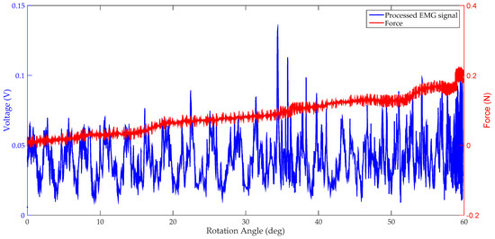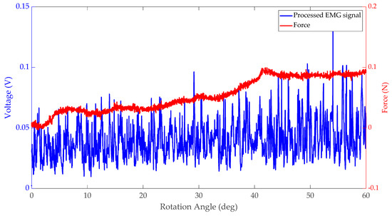 The experimental result for case one is shown in Figure 6, where the biceps muscle activities and interaction force were recorded while the forearm flexed. The maximum value for the interaction force is 0.098 N, and the mean value for the sEMG signal is 0.0366 V. On the contrary, for case two, which is shown in Figure 7, the maximum value for the interaction force is 0.2127 N while the mean value for the sEMG signal is 0.0376 V. By comparing these two experiments, it can be seen that the control system performs well; the proposed impedance controller effectively solves the backdrivability problem.