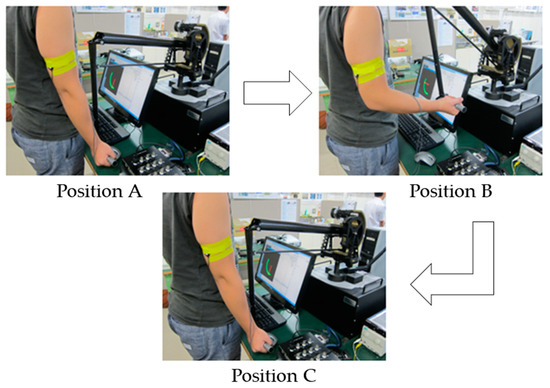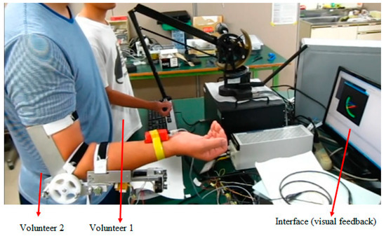 The experimental process is illustrated in Figure 8, where the therapist was requested to do the elbow flexion and extension movement following the order. Also, a similar visual model without unnecessary parts, that is, just one beam which corresponds to the elbow motion was developed for reminding the volunteer of their position. Meanwhile, the volunteer should resist the force exerted by the haptic device and keep a steady speed. Only signals from biceps were recorded, and the method is similar to that introduced in Section 4.1. Here, the resulting force that is exerted by the haptic device is calculated with Equations (12) and (13), and only the angular position error was used with different as given in Table 1.