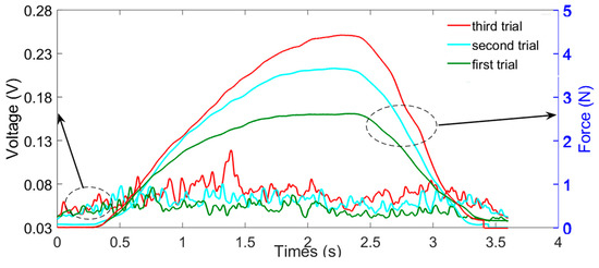 The experimental result for three trials with different is shown in Figure 9. It can be seen that the amplitude of the value was increased although a relatively small force was exerted by the haptic device.