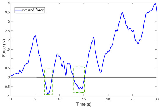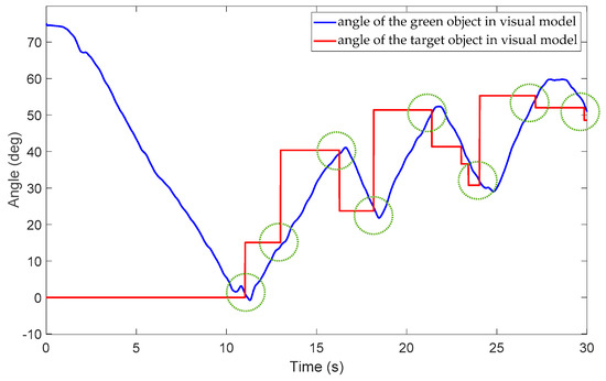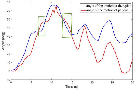 During the experiment, volunteer 2 was requested to track the target object through the visually shared model. Volunteer 1 can exert either assistive or resistive force via the model. The exerted force can be generated by the exoskeleton to patients, while volunteer 1 can simultaneously feel the force. The visually shared model developed with graphic interface provides a visible understanding of movement. The target object may change its position randomly after the green object reaches it as shown in Figure 2, and a new round of trials will start. The experimental results are shown in Figure 11, Figure 12 and Figure 13. Figure 11 shows that volunteer 2 tracked the target object eight times, as the green circles indicate. The angle of the target object changes its position after the green object reaches it. For the proposed telepresence system, the therapist can exert both assisting and resisting force through the system. Figure 12 and Figure 13 show that volunteer 1 can exert assistive force when the force is larger than zero. The resistive force can also be exerted when the force is smaller than zero. In Figure 12 and Figure 13, the green rectangles indicate the moments when a resisting force is exerted by the therapist. In addition, both the strategy and intensity can be changed according to therapist’s supervised therapy. The therapeutic experience is important for the further regeneration phase.