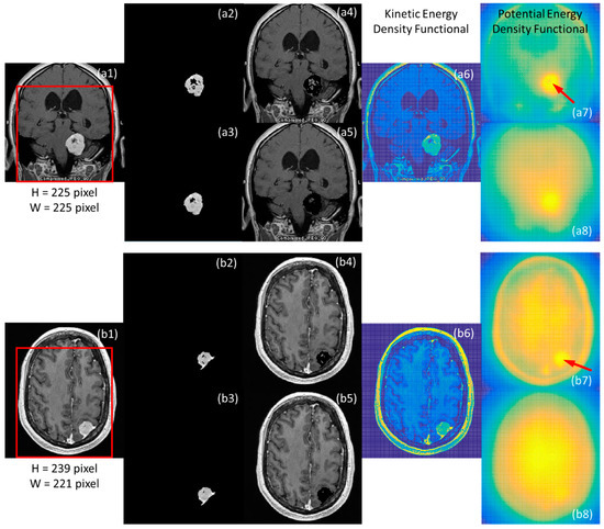 Figure 1 illustrates the results of image segmentation utilizing various potential kernels and sharpened kinetic energy density functionals. The original MR images are illustrated in Figure 1(a1,b1), respectively, and regions of interest (ROI) are also indicated in both original images using red rectangular windows. The size of each window was set to be 80% length and width of each image to avoid catching undesired featured components from skulls. The segmentation results, shown in Figure 1(a2,a4,b2,b4), were obtained using the simple potential kernel in Equation (2), while those shown in Figure 1(a3,a5,b3,b5) were obtained using the square-root potential kernel in Equation (6). Morphologies of kinetic energy density functional of employed original MR images are, respectively, illustrated in Figure 1(a6,b6). Then, morphologies of potential energy density functionals with the simple potential kernel are, respectively, shown in Figure 1(a7,b7), while those with the square-root potential kernel are, respectively, shown in Figure 1(a8,b8). From the profiles of the potential energy density functionals, it is obvious that the smooth performance of using the square-root potential kernel was better than that of the simple potential kernel. For instance, the spot indicated by the red arrow inserted in Figure 1(a7) became smooth when replacing the simple kernel using the square-root potential kernel, and the result is shown in Figure 1(a8). Thus, the segmentation result was also smoothened, as shown in Figure 1(a3). By comparing Figure 1(a2,a3), the fragmentary parts of the segmentation result using the simple kernel was mended by means of the square-root kernel. Similarly, the high energy part indicated by the red arrow shown in Figure 1(b7) was smoothened by taking the square-root kernel, and the smoothing segmentation result is shown in Figure 1(b3). It is noted that, in the tentative experiments, the segmentation consequences using the Yukawa potential kernel did not exhibit obvious benefits compared to the simple one in the employed MR images.