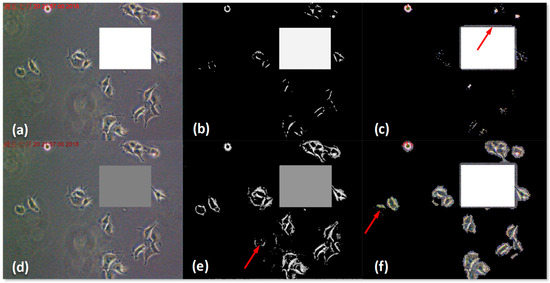 To search the limitation of the Otsu’s method and the proposed algorithm, a set of images with artifacts were also employed and the segmentation results are illustrated in Figure 5. Figure 5a,d exhibits the cell culturing images having artifacts with intensities of 1 and 0.5, respectively. Then, Figure 5b,c, respectively, shows the segmentation results by means of the Otsu’s method and the proposed algorithm in the case of Figure 5a. Similarly, Figure 5e,f shows the case of Figure 5d. In the case of Figure 5a, these two methods almost failed to extract the images of cell bodies from the original image. Meanwhile, a slight border extension of the artifact happens in Figure 5c, as indicated by the red arrow. By comparing the outcomes in Figure 4, the undesired components caused by the noise was extracted by the Otsu’s method, as indicated by the red arrow in Figure 5e. Then, an extended border of the artifact and a fragmented cell extracted by the proposed algorithm are illustrated in Figure 5f. Under the circumstance of employing the artifacts, the proposed algorithm could still extract the information of the intercellular substances inside each cell.