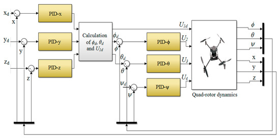 To manage the system dynamics, a simplified model is needed. By considering small rotations (cos x = 1 and sin x = x), the equations become linear and the PID controllers’ inputs can be clearly seen. Consequently, the control inputs for ϕ, θ, and ψ are U2, U3, and U4, respectively. To deal with the under-actuated part, ϕ, θ, and U1 are used to create three virtual control inputs so that every output will be controlled separately. Physically, these virtual controls mean that the translation motion along x, y, and z are controlled indirectly by the three common inputs (ϕ, θ, and U1). These virtual controls are given by Equation (19) and the desired trajectories of roll (ϕd), pitch (θd) and U1d are obtained by inverting Equation (19).
