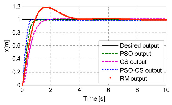 Quadrotor’s position x using Particle Swarm Optimization (PSO), Cuckoo Search (CS), Particle Swarm Optimization-Cuckoo Search (PSO-CS), and Reference Model (RM).