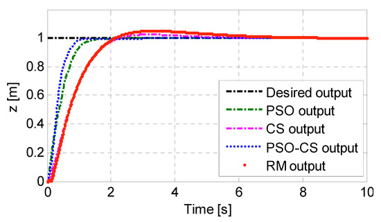 Quadrotor’s altitude z using Particle Swarm Optimization (PSO), Cuckoo Search (CS), Particle Swarm Optimization-Cuckoo Search (PSO-CS), and Reference Model (RM).