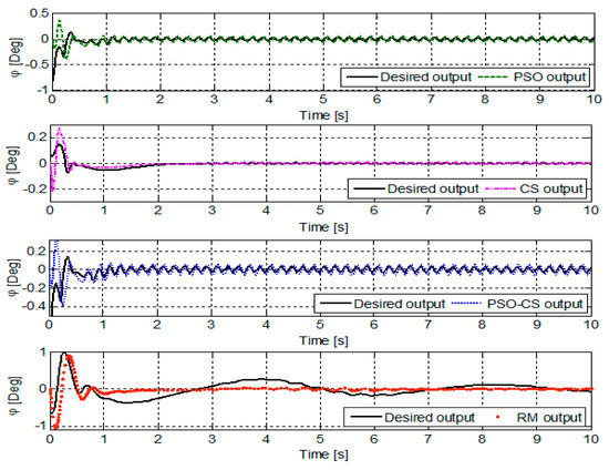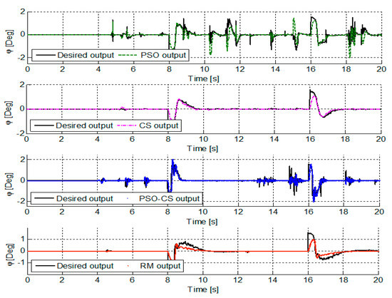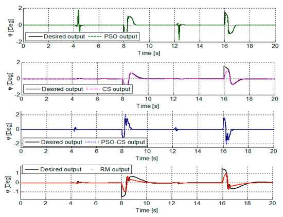 Quadrotor’s roll attitude (ϕ) using Particle Swarm Optimization (PSO), Cuckoo Search (CS), Particle Swarm Optimization-Cuckoo Search (PSO-CS), and Reference Model (RM).