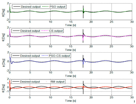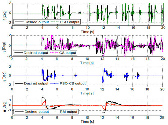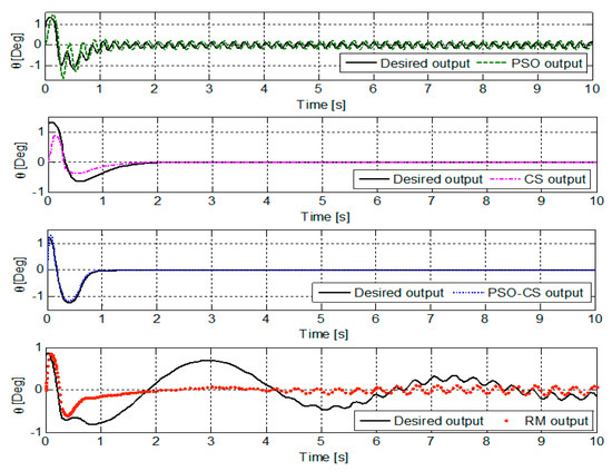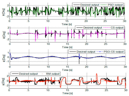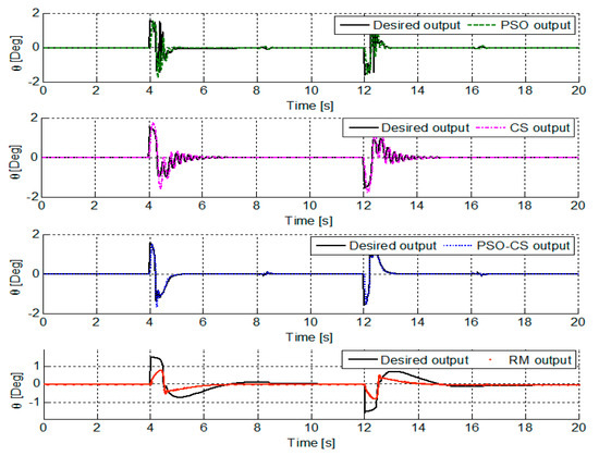 Quadrotor’s pitch attitude (θ) using Particle Swarm Optimization (PSO), Cuckoo Search (CS), Particle Swarm Optimization-Cuckoo Search (PSO-CS), and Reference Model (RM).